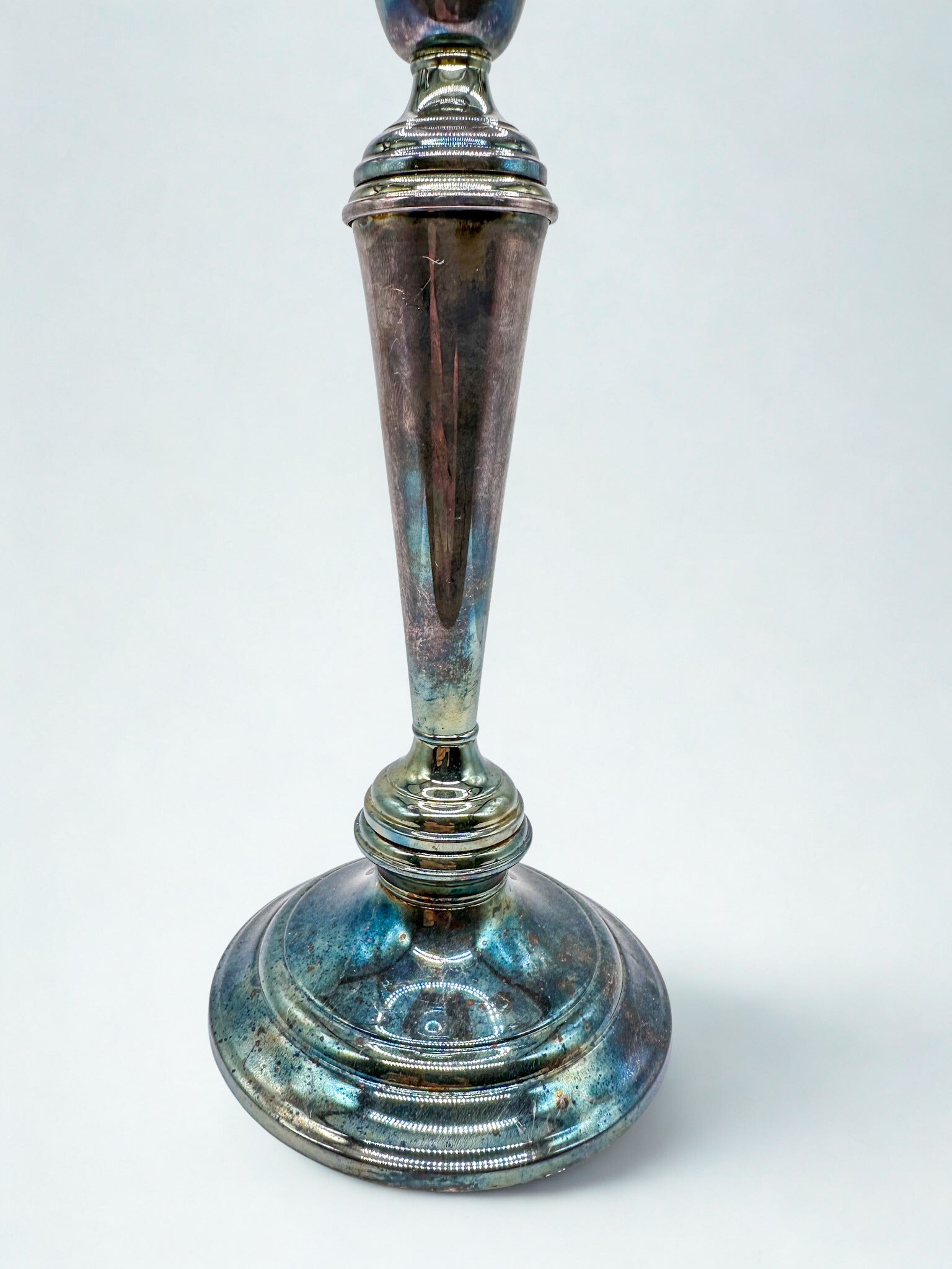 Elevate your space with this exquisite antique silver candelabra, a three-arm beauty steeped in history and rich with character. Crafted in the early 20th century, its classical curves and ornate detailing evoke the grandeur of Victorian and Edwardian design. The naturally aged patina—an iridescent blend of blue, green, and violet—adds depth and drama, making it a true statement piece.