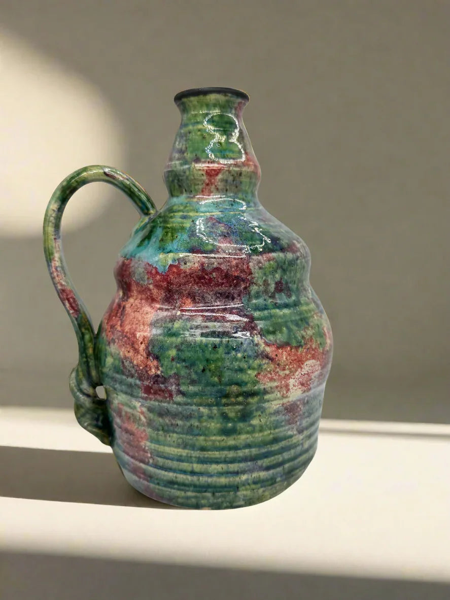 This jug showcases the ancient technique of marbled glazing, where multiple colored glazes are carefully applied and manipulated to create swirling, organic patterns. No two pieces are identical - the interplay of colors creates a mesmerizing surface that catches light beautifully throughout the day.