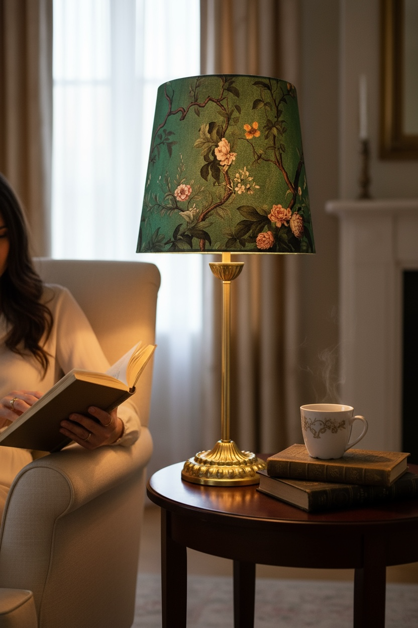 Bring nature’s poetry indoors with this striking table lamp, where vintage elegance meets botanical artistry. The slender gold stem rises from a fluted, circular base adorned with raised embellishments—evoking the charm of antique brass. A lush green lampshade blooms above, hand-illustrated with winding branches, soft pink peonies, and delicate white blossoms inspired by traditional Asian floral motifs.