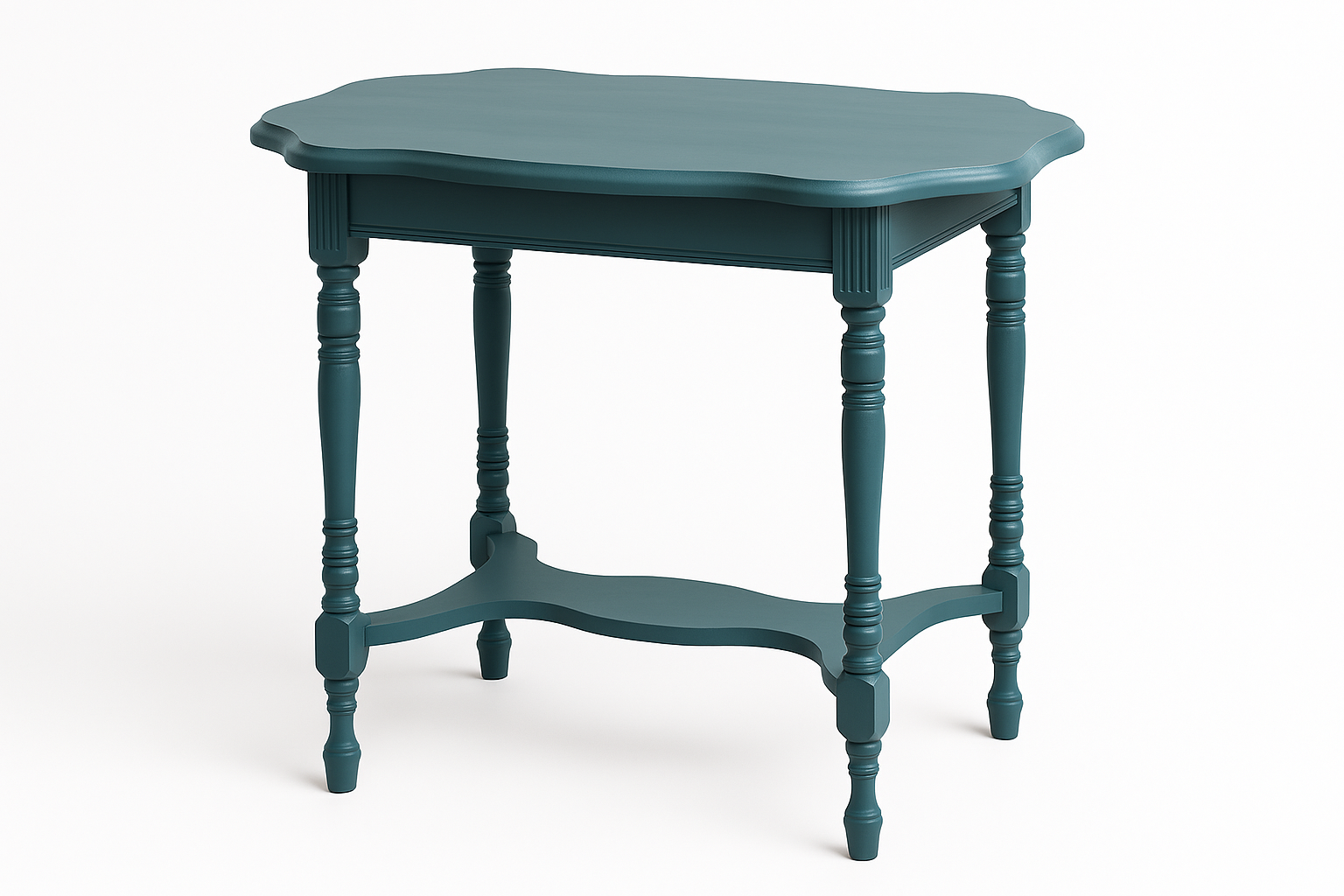 A soulful blend of heritage and hue, this refinished vintage accent table brings sculptural charm and deep color to any space. Hand-painted in lush dark green, the scalloped tabletop and turned legs nod to old-world craftsmanship, while the updated finish adds a bold, modern twist. Dimensions: 29" height, 30" wide, and 28" deep, making it ideal for styled corners or layered vignettes.