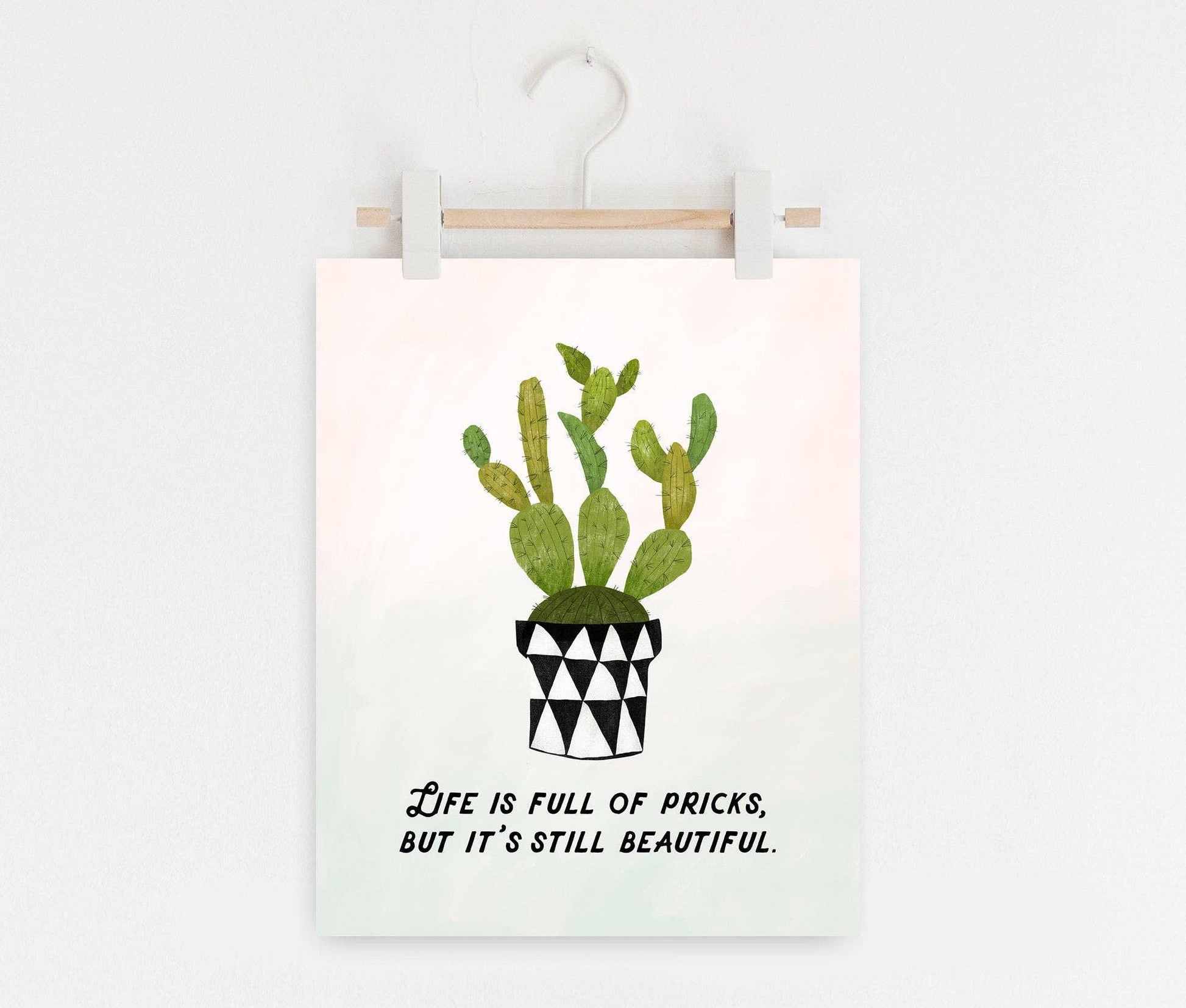 “Life is full of pricks, but it’s still beautiful.” This playful yet poignant art print celebrates resilience with a wink. Featuring a stylized cactus in a geometric pot and a bold quote beneath, it’s a reminder that beauty thrives—even in thorny moments.