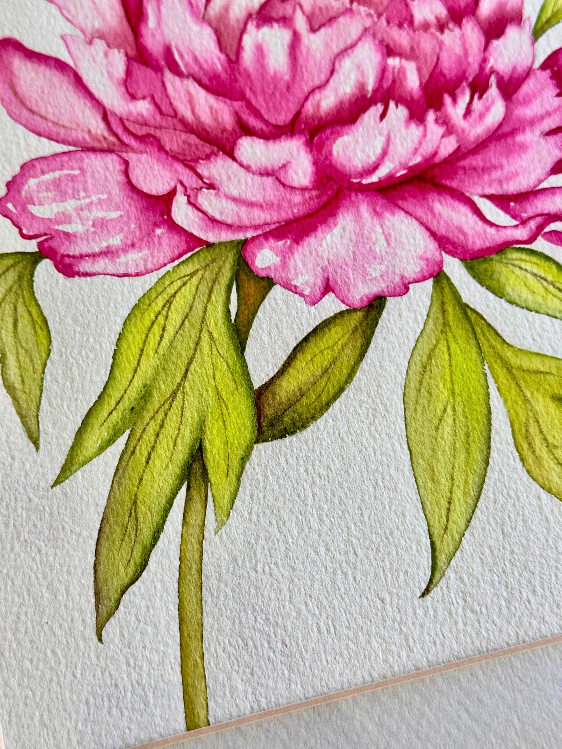 Delicate yet bold, this original watercolor painting of a pink peony captures the quiet drama of nature in bloom. Rendered with masterful brushwork and layered washes of blush, rose, and coral, the petals unfold in soft gradients while verdant leaves anchor the composition. Signed by the artist and framed in a light wood with a crisp white mat, this piece radiates freshness and timeless femininity.